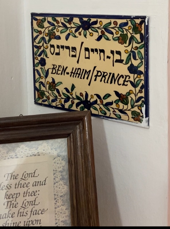 After getting in the small elevator to the third floor, we stepped out and turned left. There, above the #10 door, was a beautiful artwork piece of Jerusalem. And to the left, just above a small ledge, on a mosaic plaque, were the names Ben Haim/Prince.
