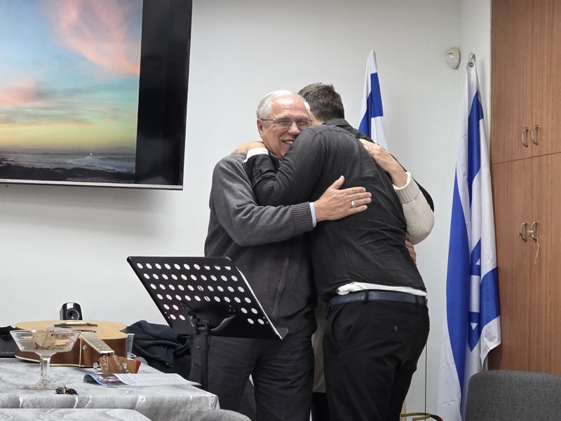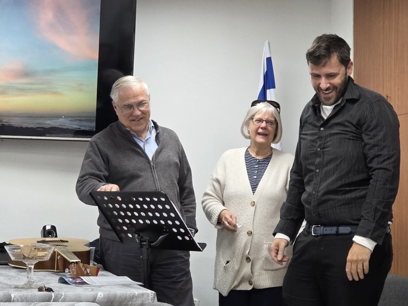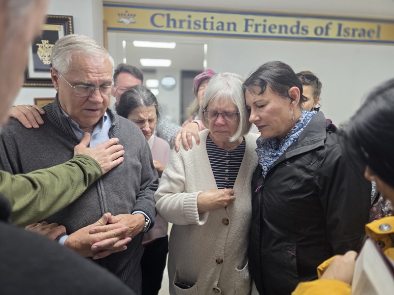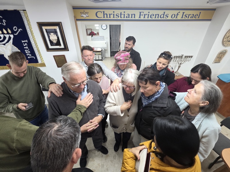 After leading the CFI-Jerusalem team in worship one more time (for now) our dear friends at Christian Friends of Israel in Jerusalem prayed for Laurie and I on our last day in the office. Having served for three months, since Oct. 16, 2025, we head back to Charlotte, North Carolina.