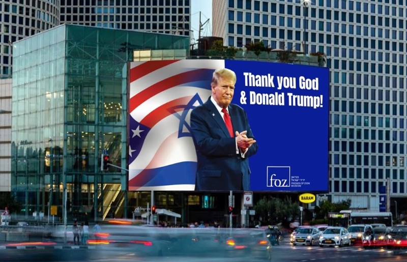 A nationwide billboard campaign is drawing attention for its bold declaration of gratitude to President Trump. The signs, placed along major highways and central intersections in Jerusalem and Tel Aviv, read: “Thank You, God & Donald Trump!”